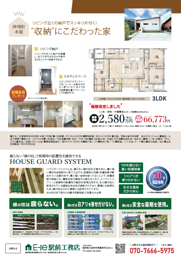 駅前工務店は久留米市東櫛原町に本社を構える工務店です。創業当時より、腐らない緑の柱のハウスガードシステムを採用した住宅建築を手掛けております。注文住宅・建売住宅・リフォーム・アパート建築など、お困りの際はぜひご相談下さい。