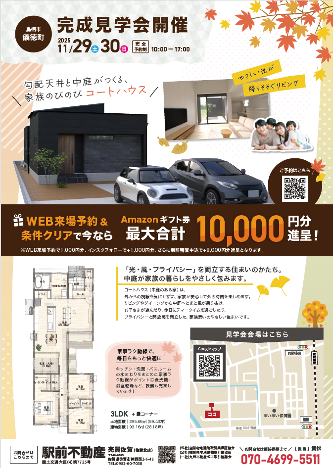 鳥栖市儀徳町に、「光・風・プライバシー」を両立するコートハウスが完成いたしました!リビングやダイニングから中庭へと光と風が通り抜け、お子さまが遊んだり、休日にティータイムを過ごしたり、プライバシーと開放感を両立した、家族思いのやさしい住まいです。