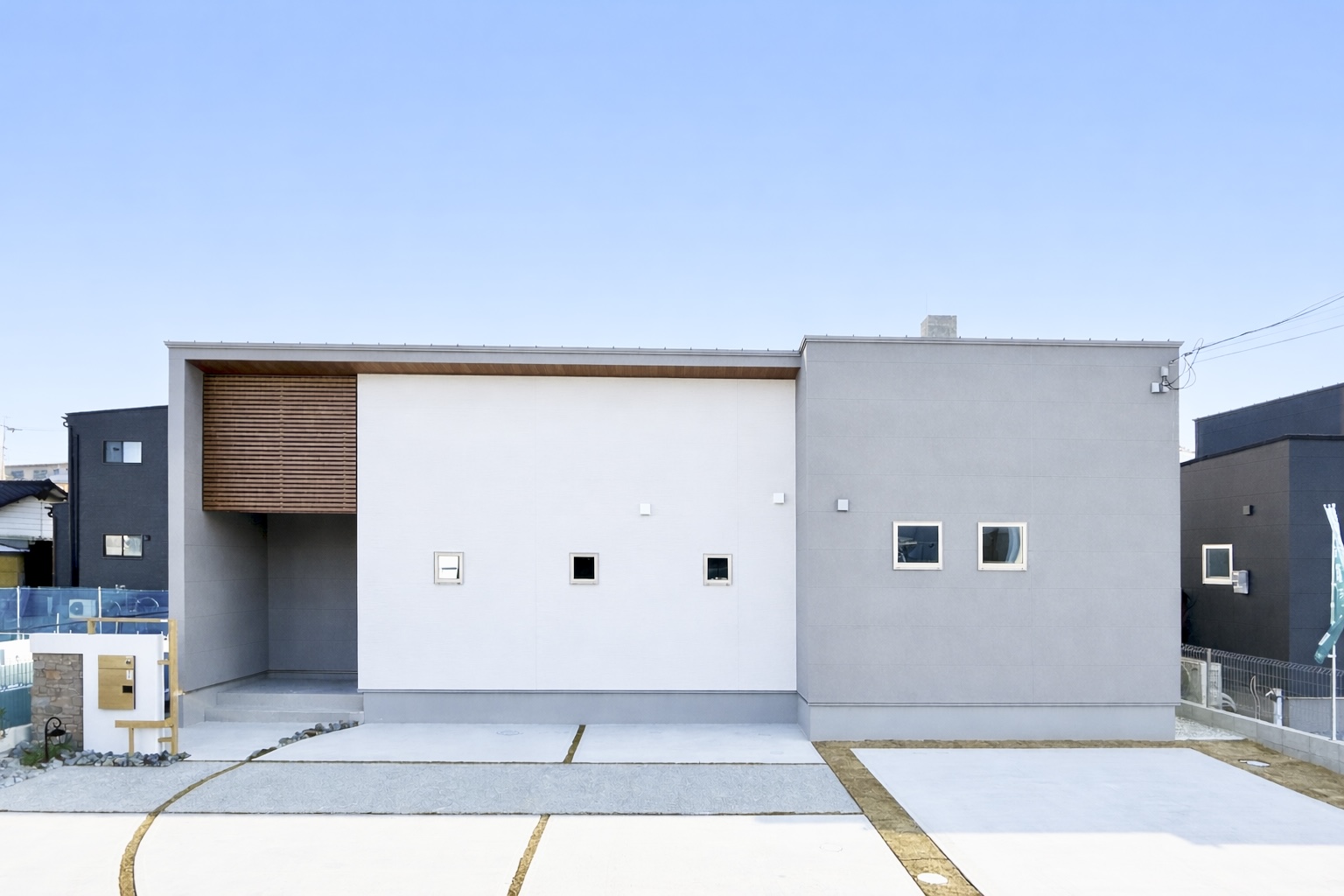 メインの外壁は駅前工務店オリジナルカラー!!絶妙なグレージュがアースな雰囲気です。広めの玄関ポーチの上には木調の格子があり、おしゃれを演出します♪玄関を抜けるとリビングの勾配天井&大きな掃き出し窓で開放感たっぷり!2間幅のテラスドアを採用。リビングのカフェ風スタディコーナーには、内窓をつけて、くつろぎの空間に♡アクセントクロスは落ち着いた茶色ベース!木やグレージュのクロスを使用した、温かみのあるモダンな印象の平屋です。