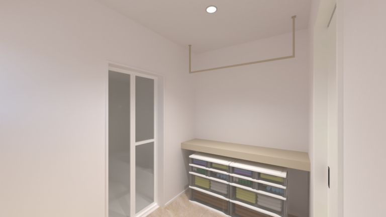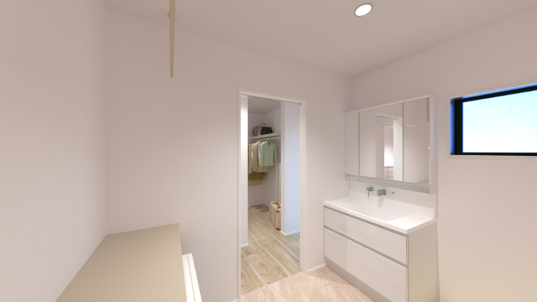 久留米市藤光町にて太陽光発電付の建売住宅の「完成前見学会」を開催いたします!洗面脱衣室のすぐ隣にファミリークローゼットを配置した家事ラク動線がポイントです。室内は明るい色使いで空間に広がりを感じさせるデザインです。