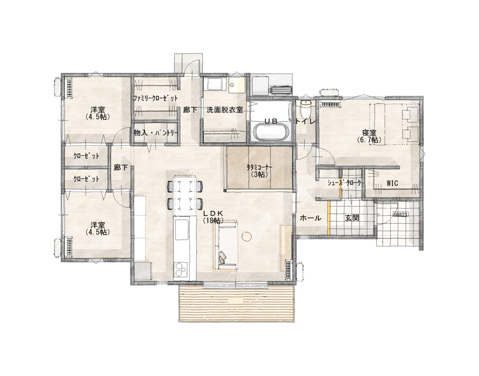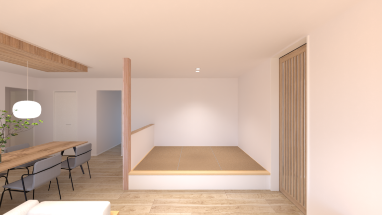 小上がりの畳コーナーは来客時やお子様の遊びスペースなど様々な用途で活用できます♪洗面脱衣室のすぐ隣にファミリークローゼットを配置することで、毎日の身支度が快適に♪コンパクトな洗濯動線で家事負担を軽減するメリットも◎洗面脱衣室のカウンター下は収納ケースを置けるスペースがあり、タオルや日用品がすっきり片付きます。