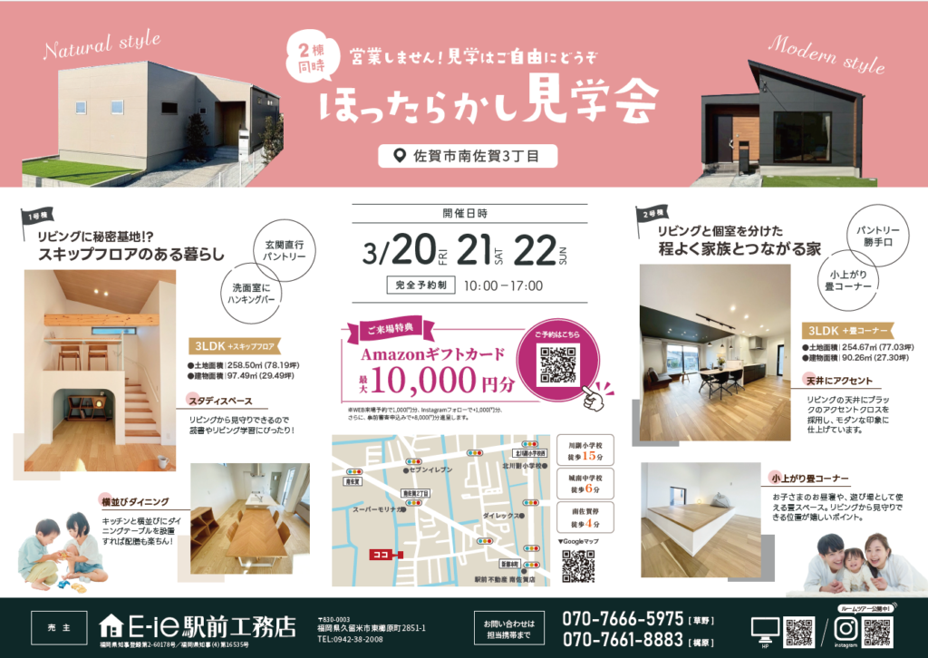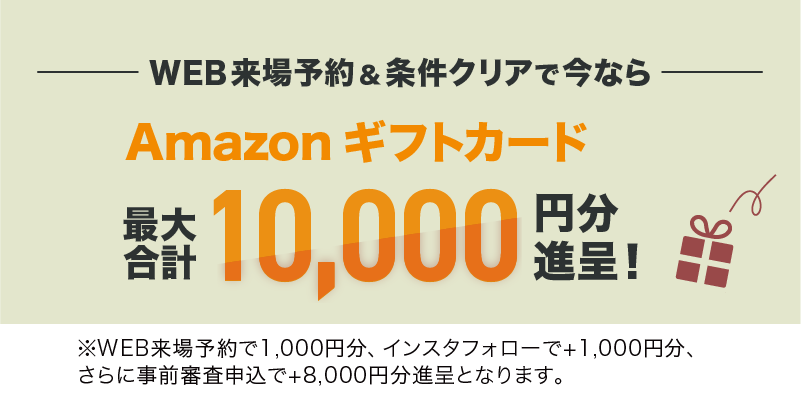 | ◆特典 | 最大10,000円分のAmazonギフト券進呈! ①来場予約で1,000円 ②Instagramフォローで+1,000円 ③事前審査申込で+8,000円 ※未成年やお一人様でのご来場は対象外 ※1組様1回のみ ※来場アンケート要回答 |