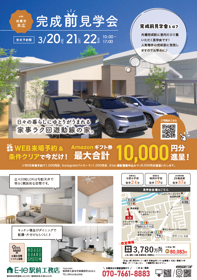 佐賀市佐賀市末広2丁目にて太陽光発電付の建売住宅の「完成前見学会」を開催いたします!完成前見学会とは、外構完成前に室内だけご覧いただく見学会です!人気物件は完成前に完売しますのでお早めにご検討ください♪
