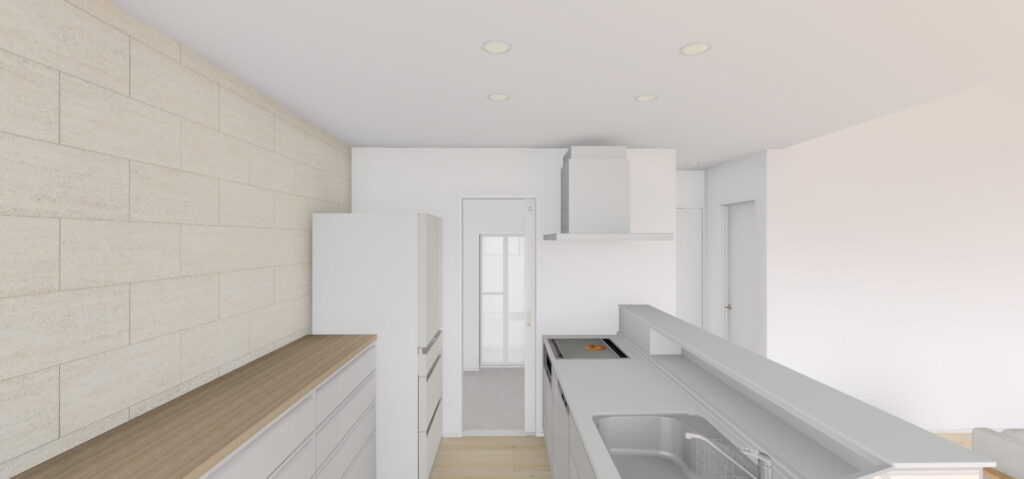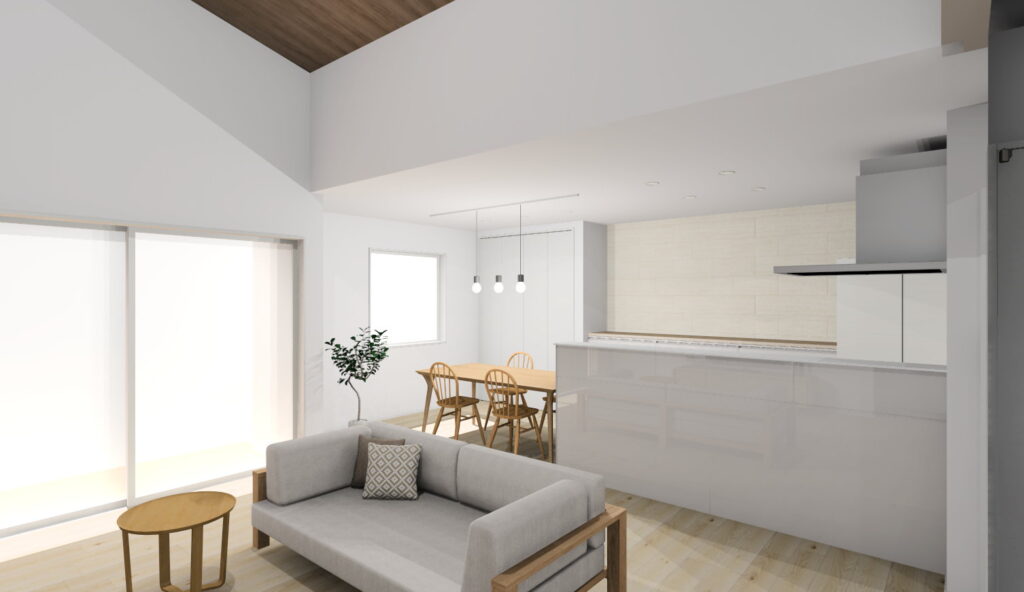 モダンな片流れ屋根で、ホワイト×ベージュのサイディングに軒天の木目のアクセントが映える温かみがありながらも洗練された外観です。開放感と日当たりの良さに恵まれたリビングは、家族が集まりやすく心地よい空間♪また、水回りがまとまっており、回遊できる動線で日々の家事をスムーズに。キッチンの物入はパントリーとして食品ストックをまとめたり、家族の共有収納としても多用途に使えます!