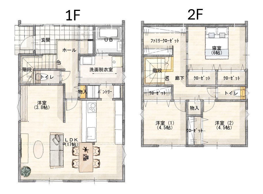 柔らかな色合いのシンプルモダンな外観!ゆとりある玄関スペースに扉付きの収納を設けることで、生活感を隠しつつ、広くスッキリ見えるよう工夫しています。また、「キッチン➡パントリー➡洗面脱衣室」の一直線の間取りは、料理・洗濯・収納といった家事動線を効率化でき、毎日にゆとりがうまれます。LDKは木目クロスを貼った勾配天井で、開放感と温かみのある空間です!リビングの一角にカウンターを設置し、在宅ワークやお子様のお勉強スペースとしても多目的に活用できます◎