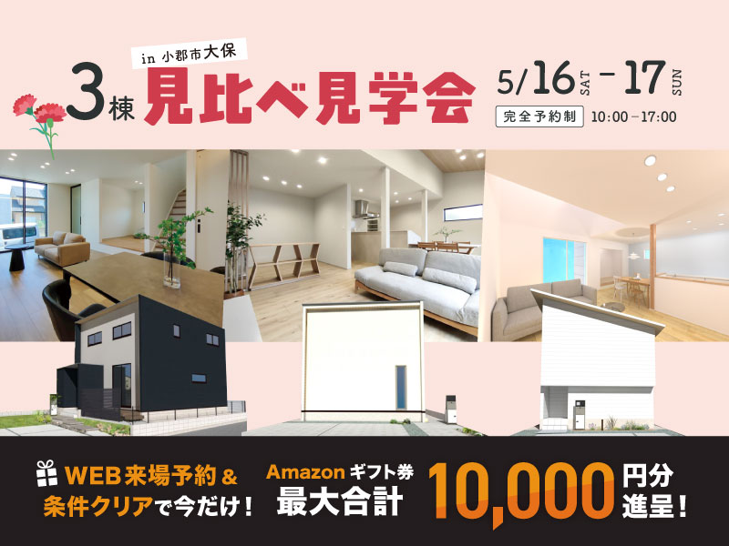 5/16-17小郡市大保にて3棟見比べ見学会を開催いたします!タイプの違う3つの暮らしをぜひご体感ください!お子様連れ歓迎!是非ご家族そろってお越しください♪ 見学会について ◆日程 5月16日(土)・17日(日) ◆時間 10:00~17:00 ◆場所 福岡県小郡市大保1538-12(1号棟) ◆特典 最大10,000円分のAmazonギフト券進呈!①来場予約で1,00…