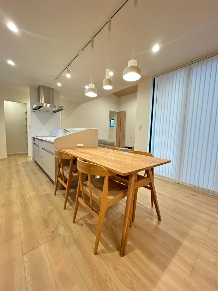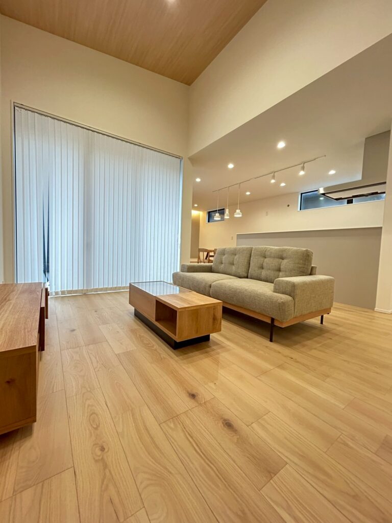 シックなブラック✖アクセントにSOLIDを使ったモダンな外観🏠リビングに入ると、目の前に勾配天井と中庭が広がり、家事ラク動線や、プライベート空間を充実させたコートハウス。さらに、リビングから南の庭につながる建具は、天井まであるサッシで開放感たっぷり!リビングから一直線なので、抜け感とワクワク感があります♪