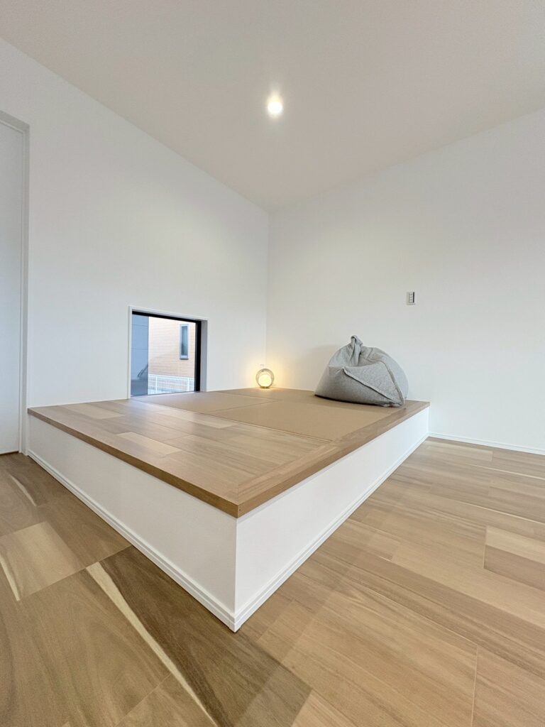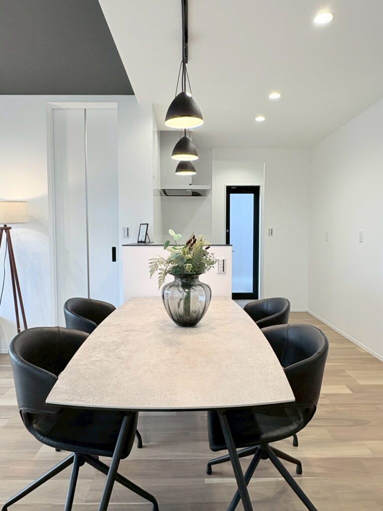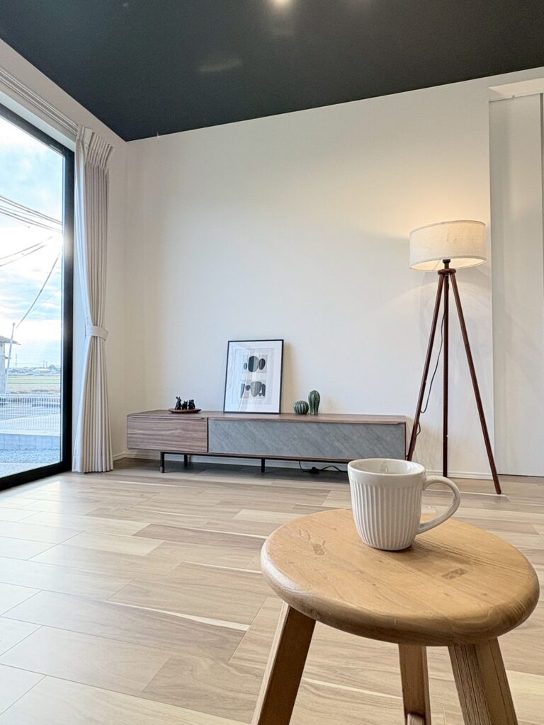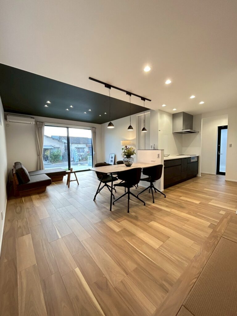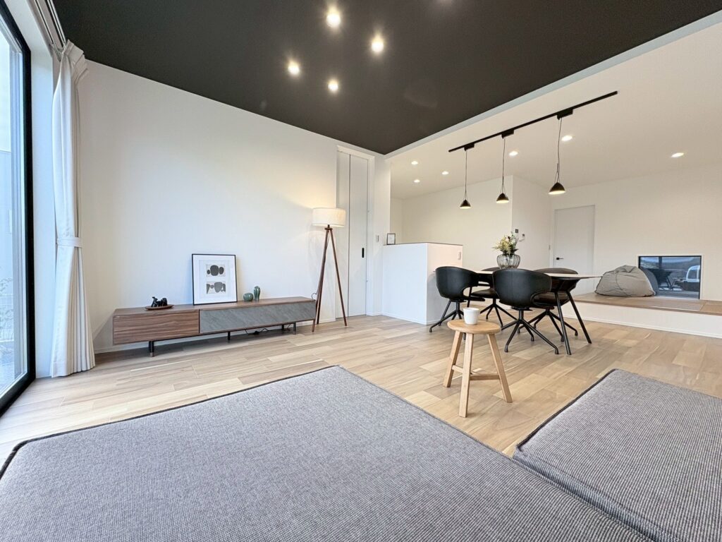 外観はブラック×木調でかっこよくモダンな雰囲気。リビングの上はアクセントに黒い天井でモダンな印象です。内部の物干しコーナー&外部のデッキ付き物干場がある特徴的な間取り!布団などたっぷり干しても外から見えにくい場所にあるのがポイントです♪プライベートルームと水回りとリビングは分かれており落ち着いて過ごせるので人気の間取りです。キッチンはリビングから少し隠れる位置にあり、片付けが苦手な方でも安心!畳コーナーはダイニングに近く、ほっと一息つける空間です♡