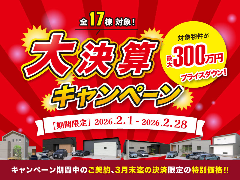 駅前工務店より、年度末の大決算キャンペーンのご案内です!2月契約・3月末までに決済可能な方に限り、大幅値引きでご案内いたします!このチャンスをお見逃しなく♪