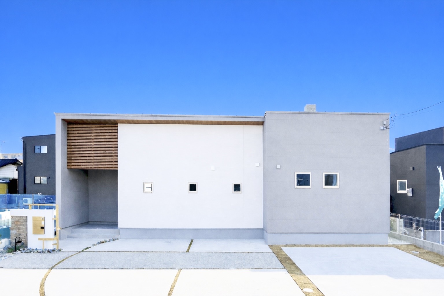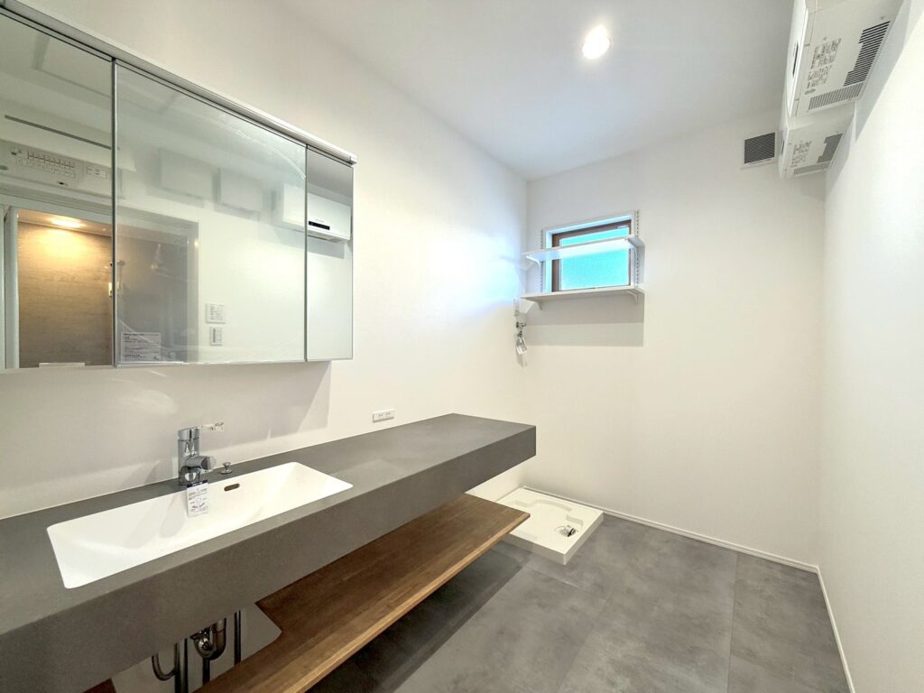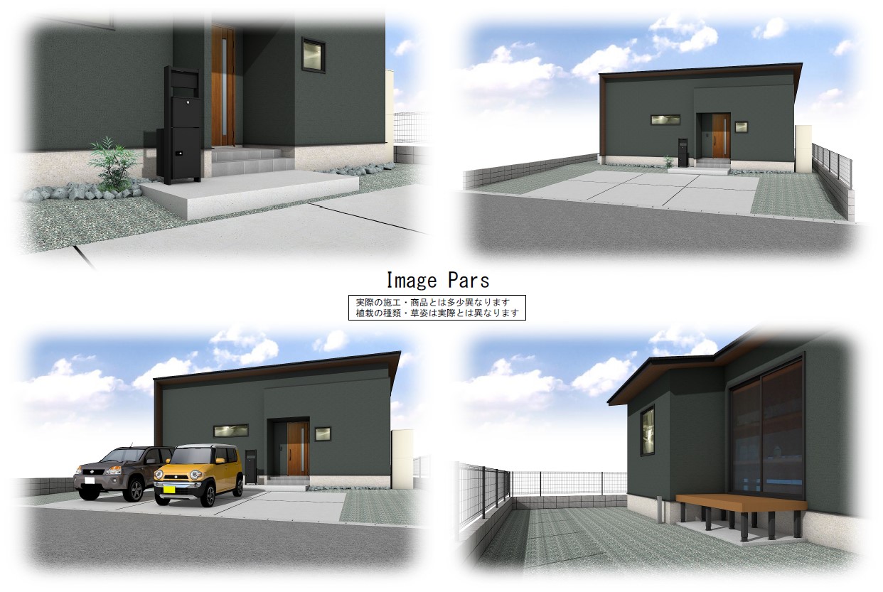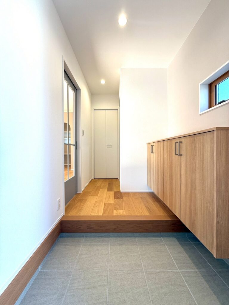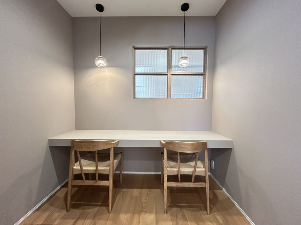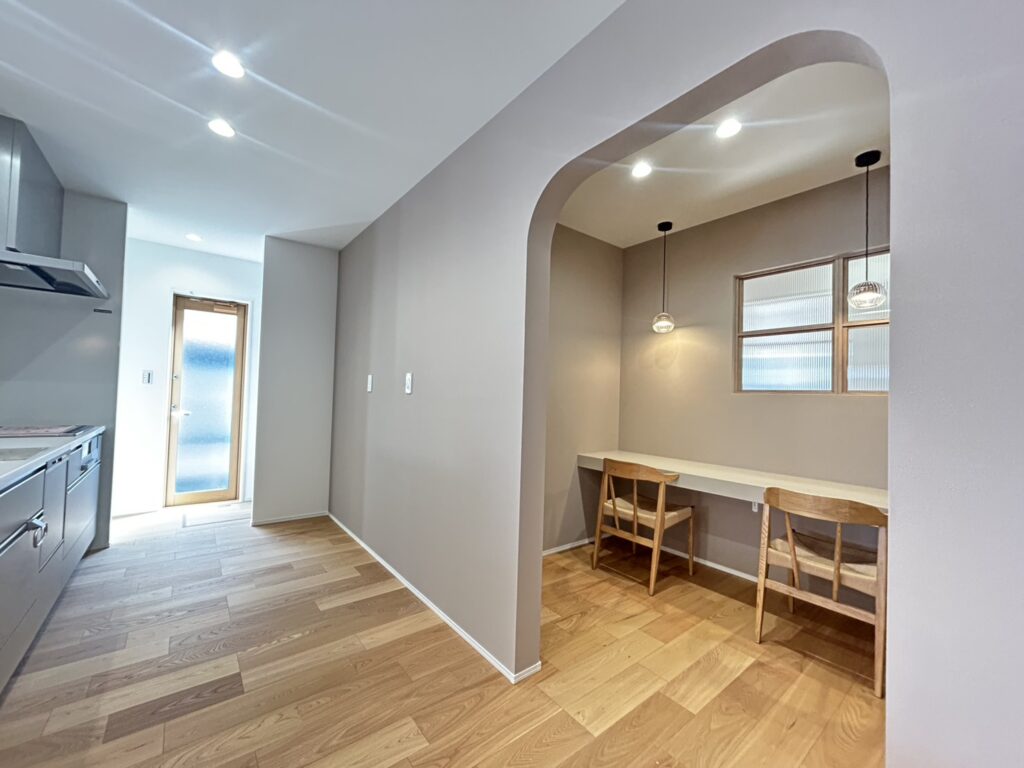 メインの外壁は駅前工務店オリジナルカラー!!絶妙なグレージュがアースな雰囲気です。広めの玄関ポーチの上には木調の格子があり、おしゃれを演出します♪玄関を抜けるとリビングの勾配天井&大きな掃き出し窓で開放感たっぷり!2間幅のテラスドアを採用。リビングのカフェ風スタディコーナーには、内窓をつけて、くつろぎの空間に♡アクセントクロスは落ち着いた茶色ベース!木やグレージュのクロスを使用した、温かみのあるモダンな印象の平屋です。