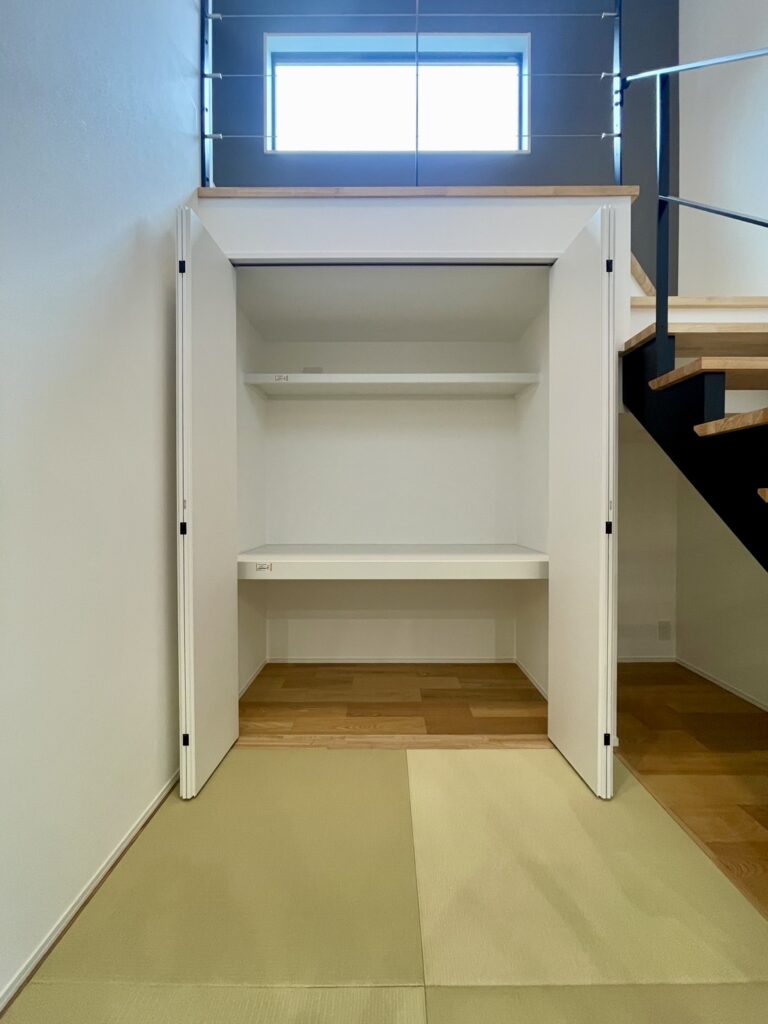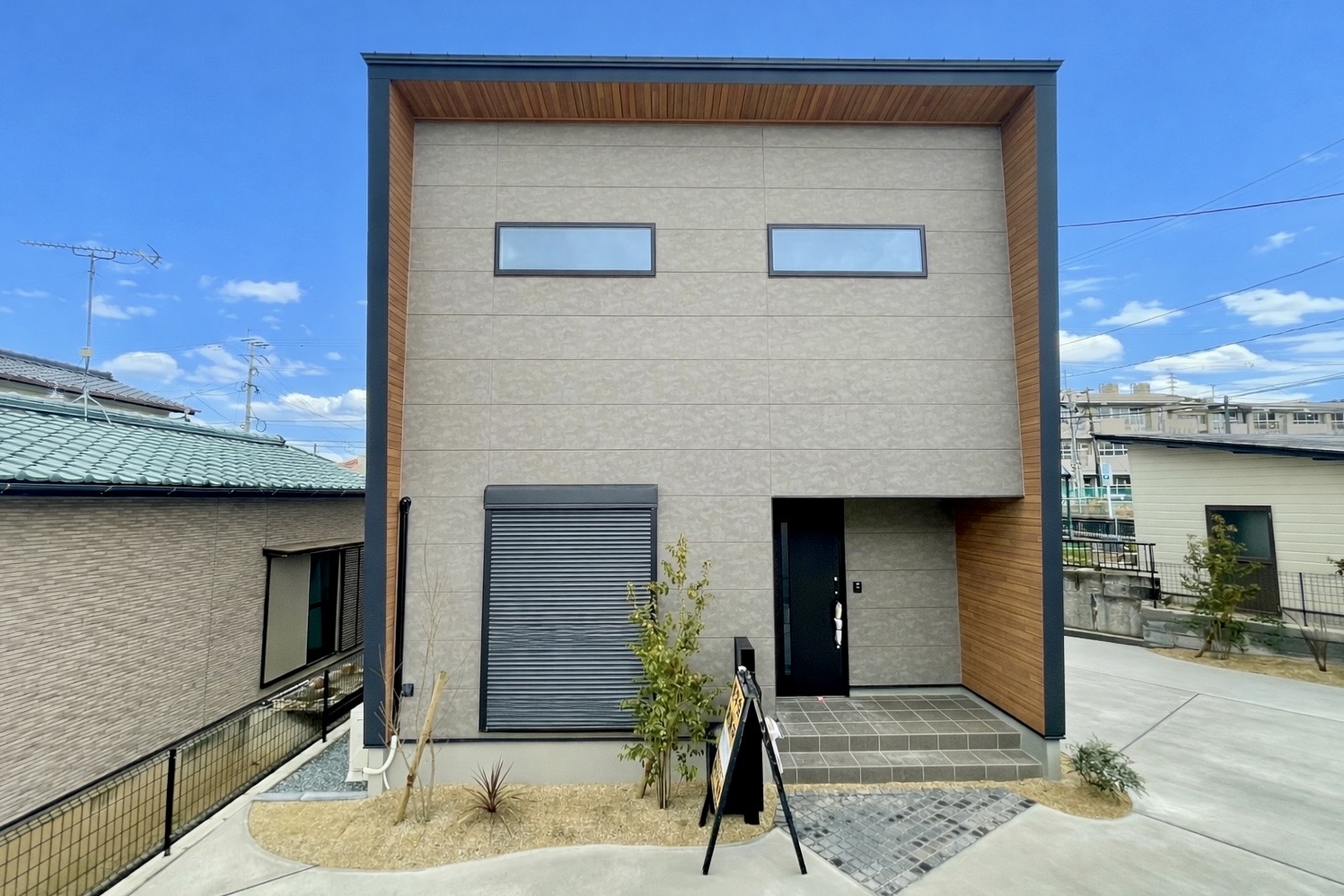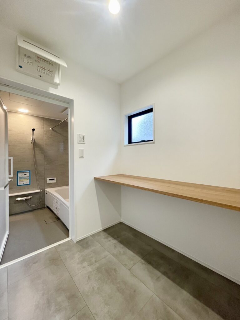 外観は斜め袖壁が特徴的!ブラック×グレーを基調に木調がアクセントのモダンで洗練された印象です。脱衣室とランドリースペースが分かれた間取りは家族の入浴と洗濯を同時にできるメリットが!また来客時でも脱衣室の生活感を見られることなく、洗面室を使ってもらえます。脱衣室の奥行き550㎜のカウンターは洗濯物の仕分けやアイロンがけなどの作業スペースとして、また着替えなどの一時置き場にもなります。和室の吹き抜け×スケルトン階段で家全体が明るく開放的に♪階段を上がったところにあるスタディスペースは家族の気配を感じながらも、作業に集中できます。3帖のウォークインクローゼットは、出入り口が2か所あるので忙しい朝に2人が同時に支度してもスムーズです♪