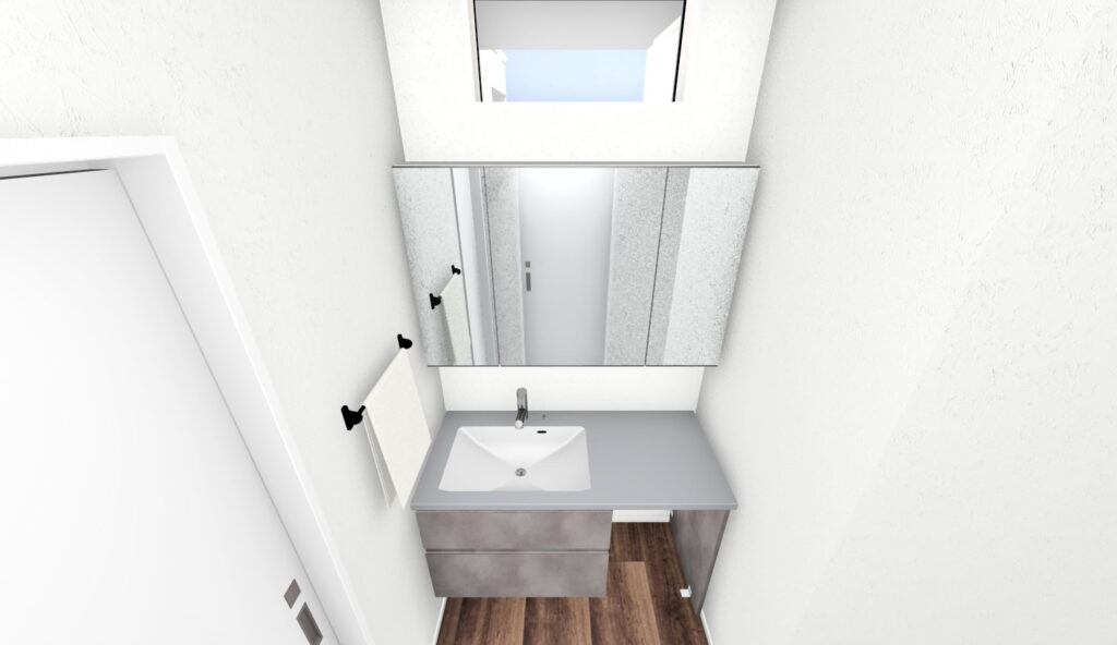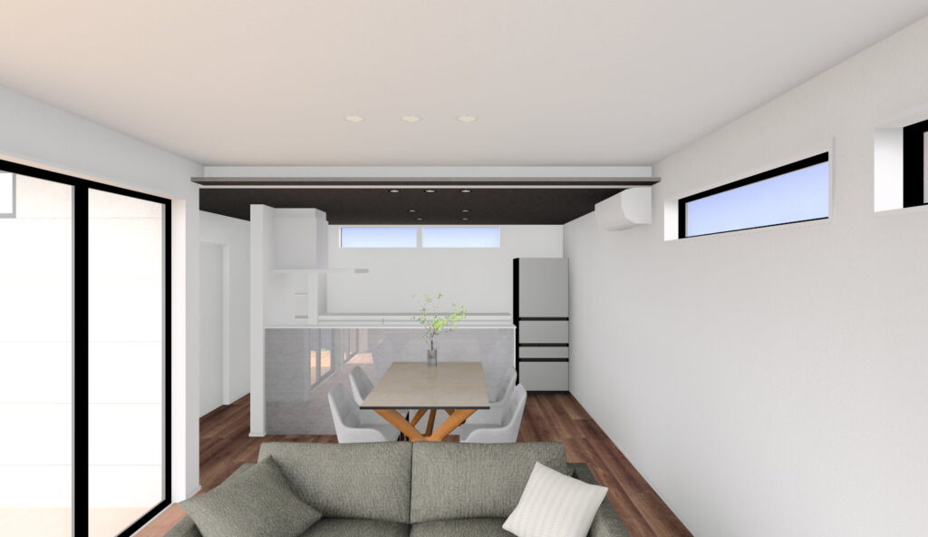 黒とグレーを組み合わせた外観はシックで洗練されたモダンな印象!LDK東側はフロアタイルを壁に施工することで素材感が際立ち、また高さ2500のハイドアがスタイリッシュかつ上質な空間に仕上げます♪キッチンの下がり天井と間接照明の組み合わせは、おしゃれで落ち着いた空間を演出し、空間の独立性に効果的な人気のデザイン!脱衣室の洗面台はオーダーメイドの造作洗面台のようなデザイン性の高い「スマートサニタリー」を採用!傷、汚れに強くお手入れしやすい素材です。ハンギングバーはデザイン性もありながら、洗う・干す・畳む・しまうといった洗濯動線が脱衣室内で完結しやすく、また壁や天井のデットスペースを利用して設置可能なため、空間を有効活用できます!