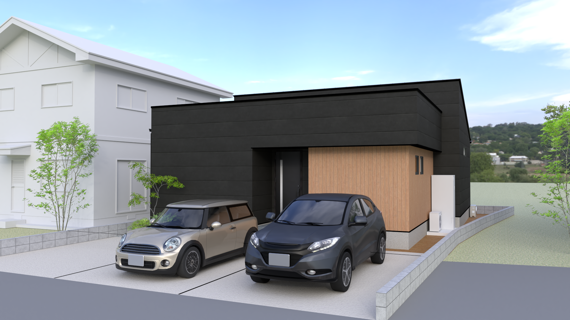 黒とグレーを組み合わせた外観はシックで洗練されたモダンな印象!LDK東側はフロアタイルを壁に施工することで素材感が際立ち、また高さ2500のハイドアがスタイリッシュかつ上質な空間に仕上げます♪キッチンの下がり天井と間接照明の組み合わせは、おしゃれで落ち着いた空間を演出し、空間の独立性に効果的な人気のデザイン!脱衣室の洗面台はオーダーメイドの造作洗面台のようなデザイン性の高い「スマートサニタリー」を採用!傷、汚れに強くお手入れしやすい素材です。ハンギングバーはデザイン性もありながら、洗う・干す・畳む・しまうといった洗濯動線が脱衣室内で完結しやすく、また壁や天井のデットスペースを利用して設置可能なため、空間を有効活用できます!