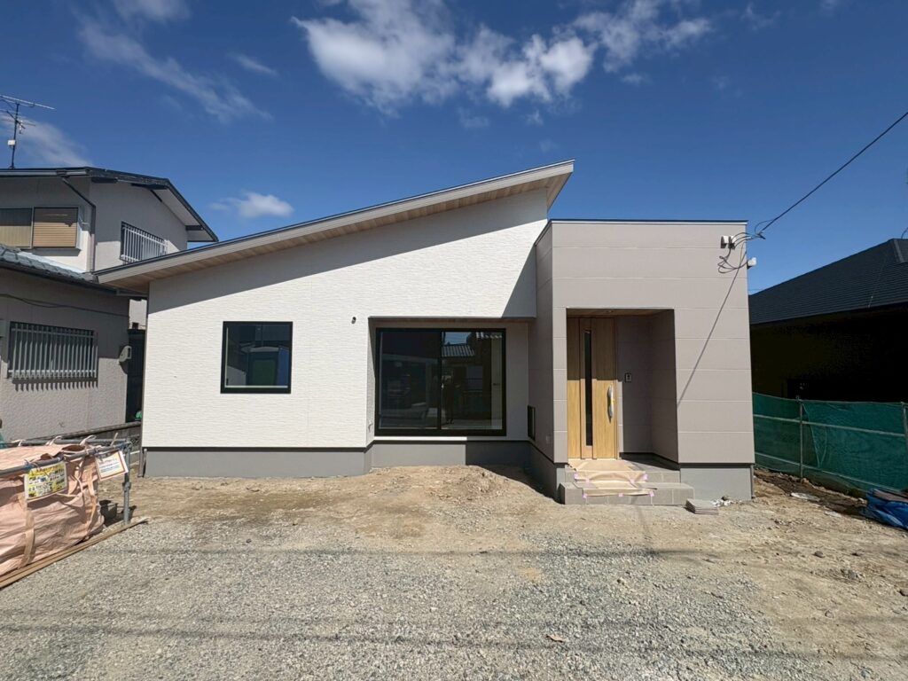 モダンな片流れ屋根で、ホワイト×ベージュの