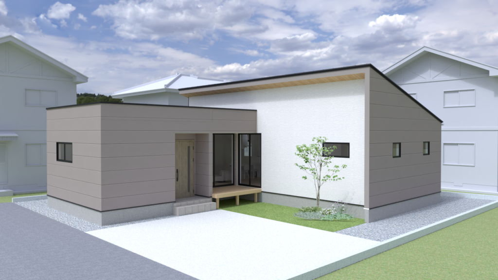 ※完成予想図は実際とは異なる場合があります モダンな片流れ屋根のスタイリッシュな外観。玄関からキッチン・リビングへのアクセスが良く、家族の生活動線と家事動線がスムーズ!ファミリークローゼットをリビング近くに設けることで、家族全員の衣類をまとめて収納でき、片付けが楽になります。小上がりの畳コーナーには棚が付いており、おしゃれで機能的な空間です。お子様のおもちゃ…
