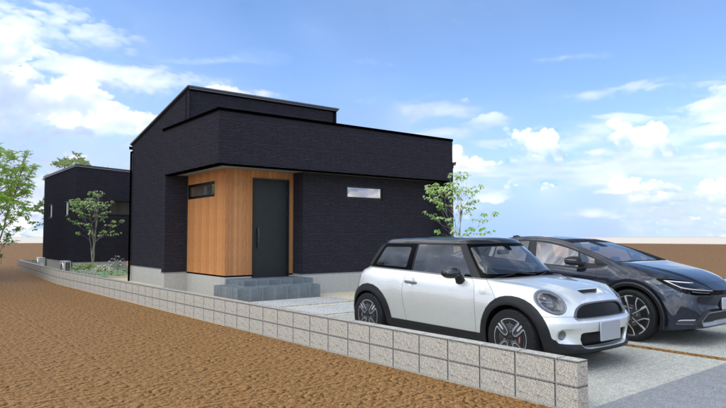 ※完成予想図は実際とは異なる場合があります ブラック×木調サイディングのモダンな外観!建物にぐるりと囲まれた中庭のあるコートハウスは、外部からの視線を気にせず、プライベートな屋外空間を確保できるのが魅力です!リビングは勾配天井による視覚的な広がりと、オーク柄の床の自然な風合いや美しい木目が調和し心地よい空間です♪キッチン周りは回遊動線で移動がスムーズ!近くに…