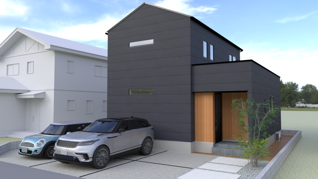 ※完成予想図は実際とは異なる場合があります ブラック×木調サイディングでかっこいい外観!リビングは勾配天井で開放感を感じます♪リビングの掃き出し窓のところには910㎜の軒があるので、暑い日差しを和らげます。また、アカシヤの床が落ち着いた印象で、和室はカウンター×吊押入れでおしゃれです!広めの玄関はインテリア格子がモダンな雰囲気。寝室と子供部屋は玄関ホールを隔…