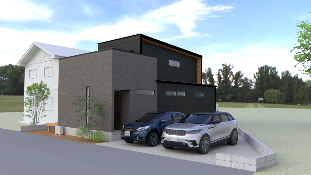 外観は黒を基調に大きな窓と、ラップタイプのサイティングでモダンな印象に仕上げました🏠こだわった間取りは、キッチンパンドリーの扉を抜けると、勝手口や水回りに行ける回遊動線になっておりスムーズに移動できます。お子様の学習やPCスペースに活用できる3帖のスタディスペース付きLDKは、ダイニング奥の吹き抜けにスケルトンの階段があり、開放的でおしゃれな空間を演出します…