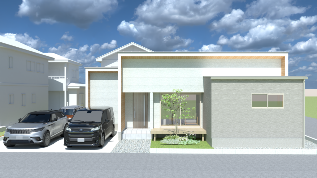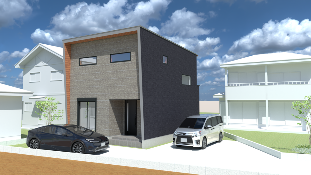 ※完成予想図は実際とは異なる場合があります 外観は斜め袖壁が特徴的!ブラック×グレーを基調に木調がアクセントのモダンで洗練された印象です。脱衣室とランドリースペースが分かれた間取りは家族の入浴と洗濯を同時にできるメリットが!また来客時でも脱衣室の生活感を見られることなく、洗面室を使ってもらえます。脱衣室の奥行き550㎜のカウンターは洗濯物の仕分けやアイロンが…
