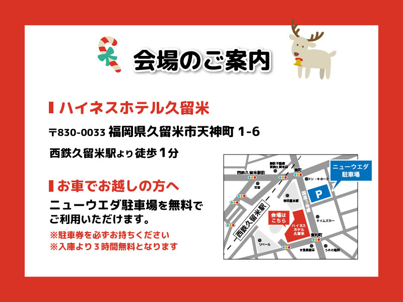 | ◆会場 | ハイネスホテル久留米 5F 千歳の間 (〒830-0033 福岡県久留米市天神町1-6) |