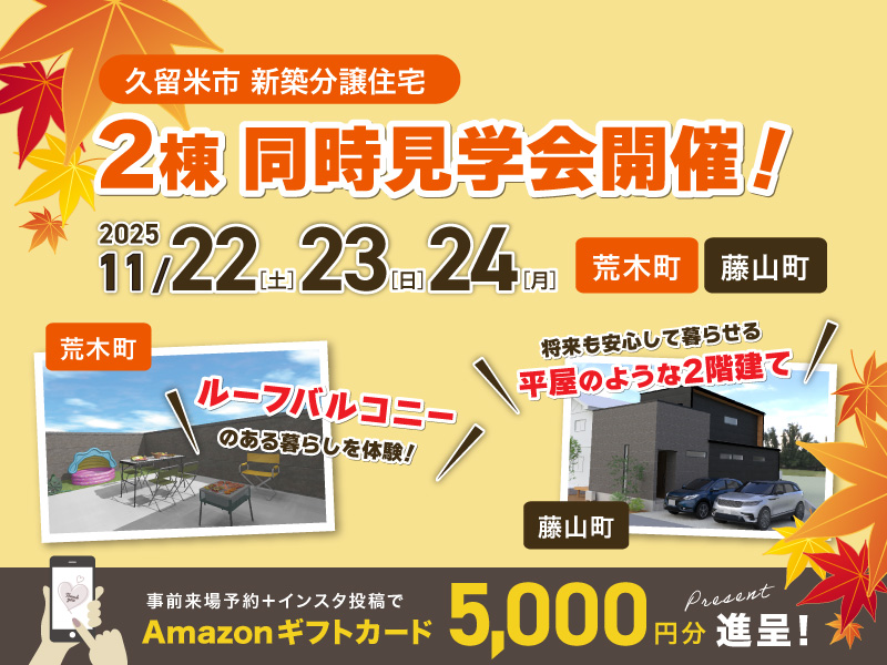 11月22日~24日の3連休に、久留米市荒木町・藤山町にて2棟同時見学会を開催いたします!それぞれ異なるコンセプトの2階建て住宅を比較できるこの機会をお見逃しなく♪ ①荒木町の詳細 荒木町の物件は、“ルーフバルコニー”のある暮らしを体験できるコンセプトハウス!水遊びや、BBQ、お家キャンプなど、家族みんなで楽しめる空間です!実際にのぼって体験してみてください…