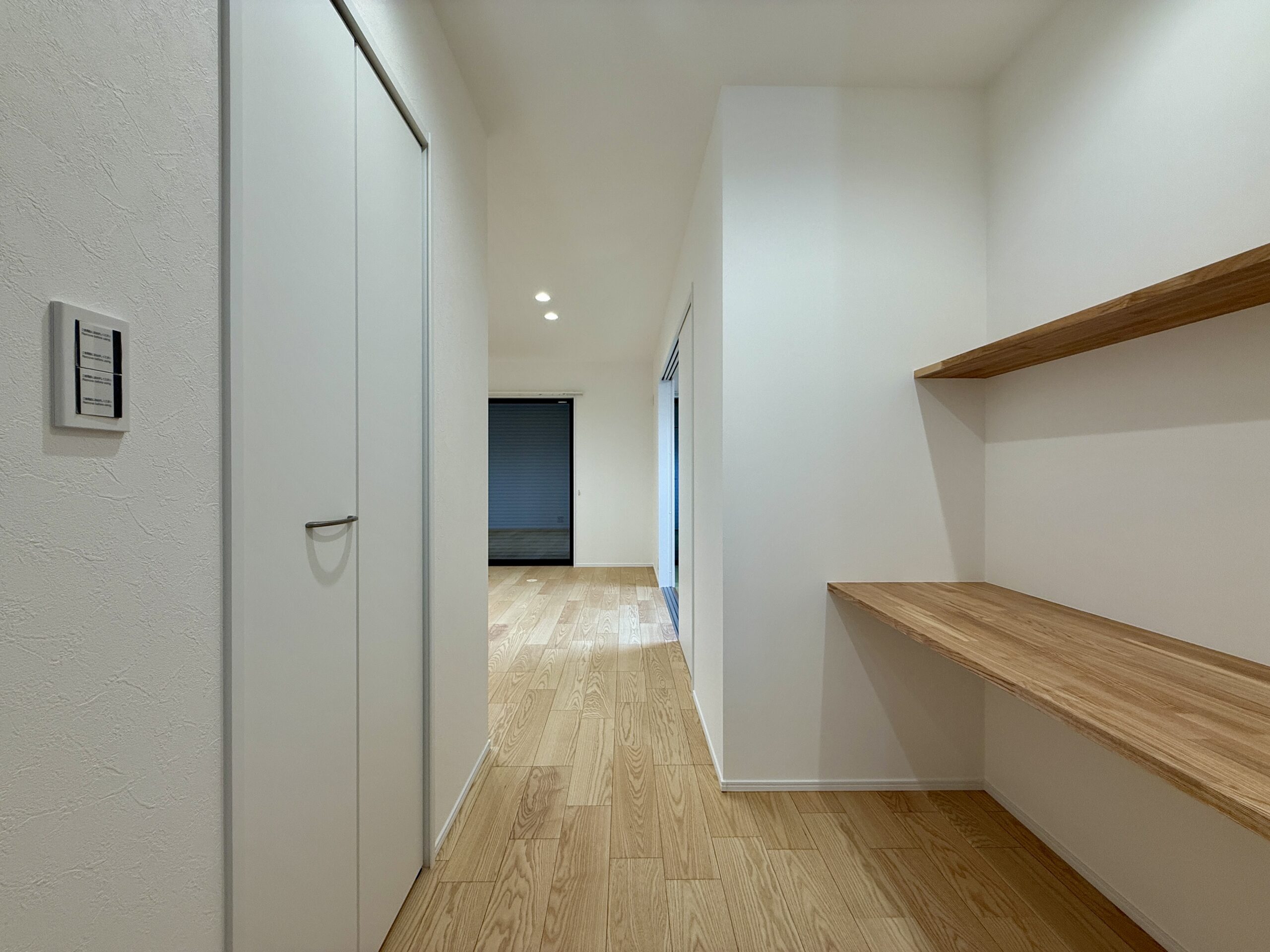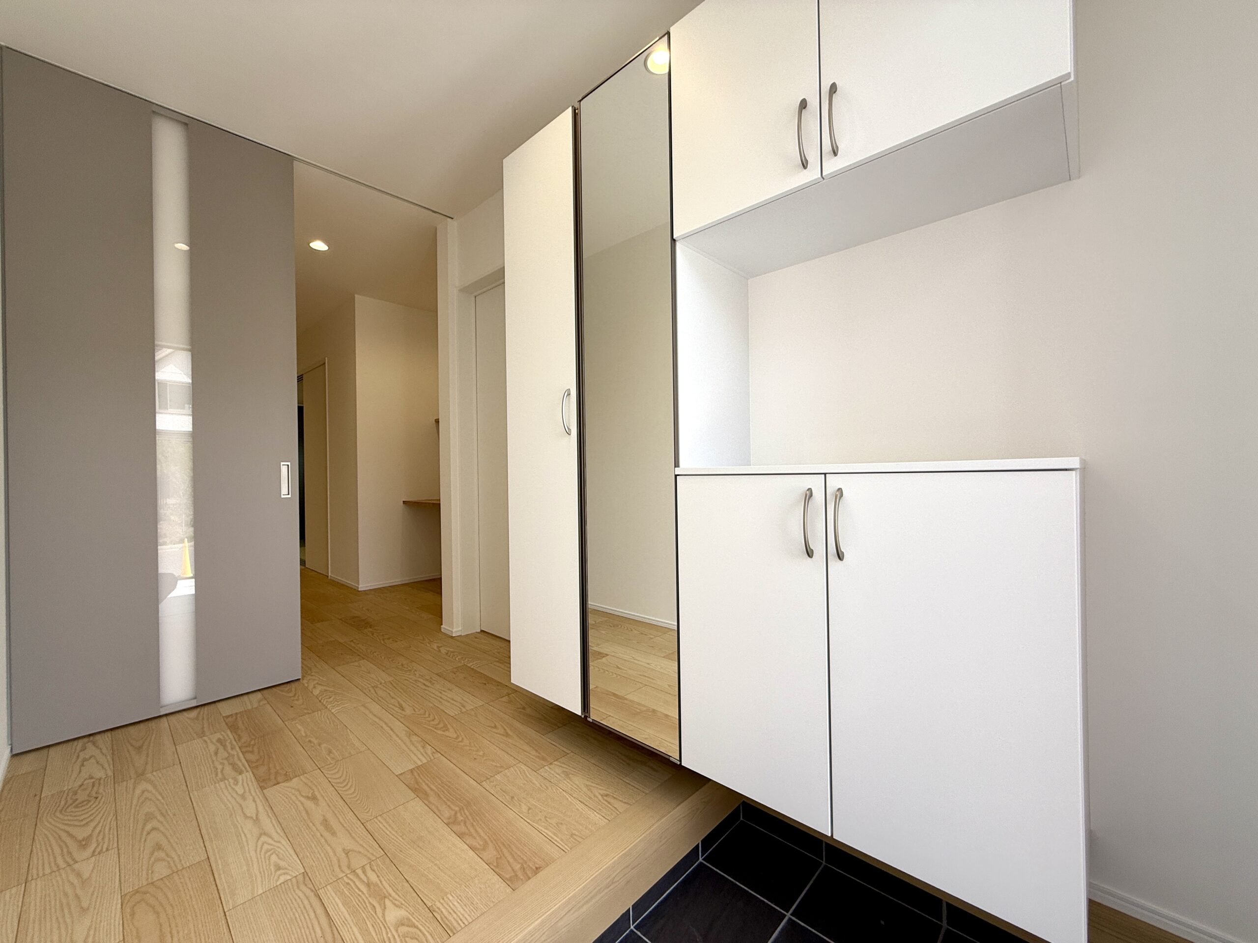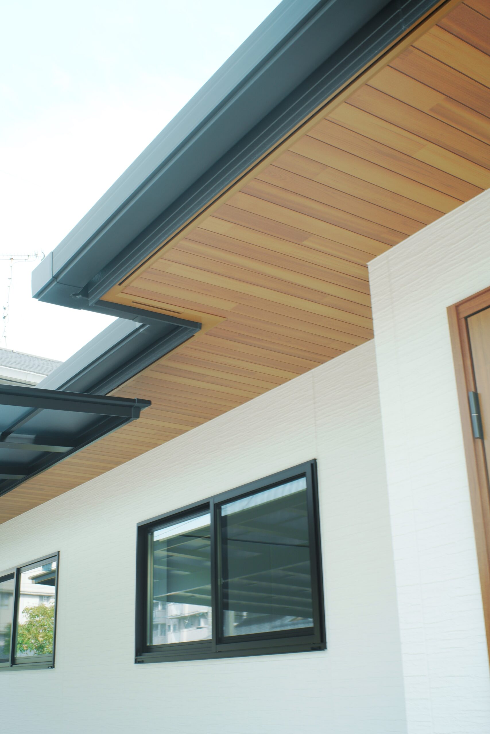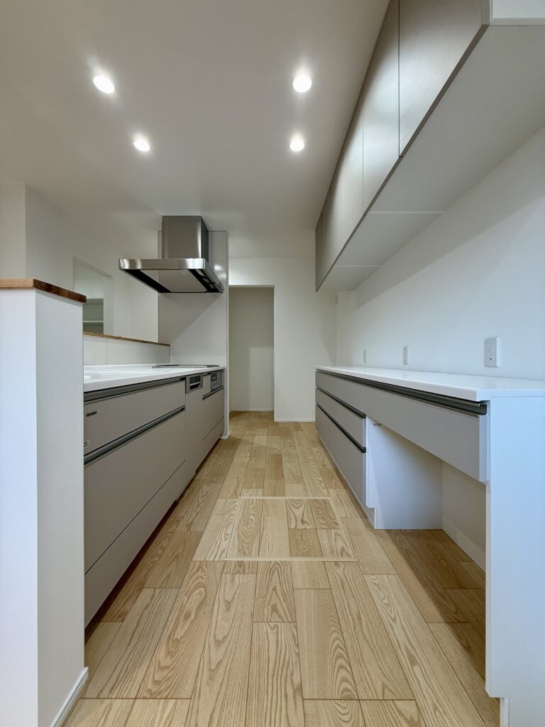 モノトーンでまとめた落ち着きのある外観に、木目の玄関ドアが温かみをプラスしています。デザイン性だけでなく、ゆとりある駐車スペースや、スムーズな生活動線など、日々の暮らしやすさにもこだわった一軒です。