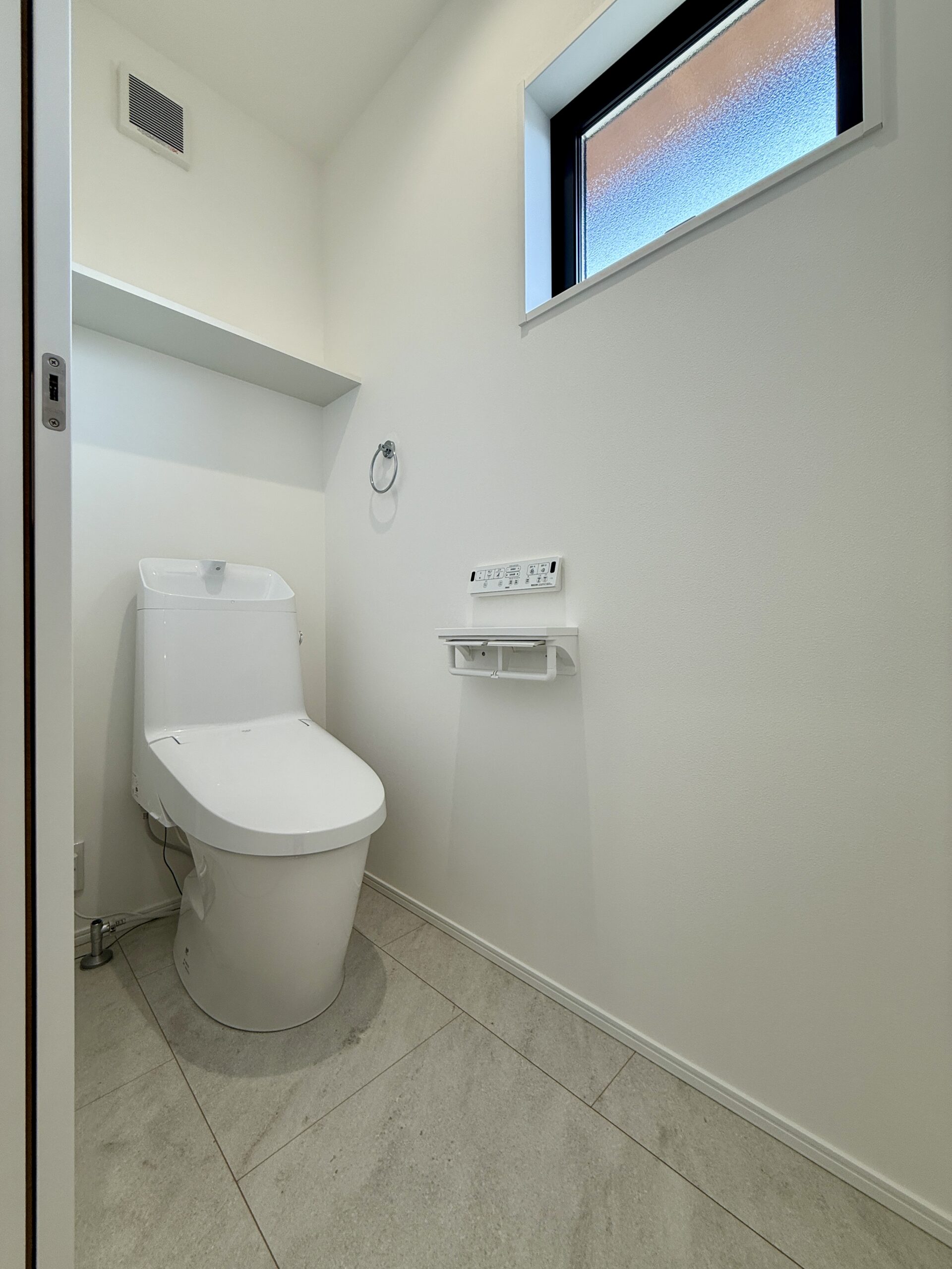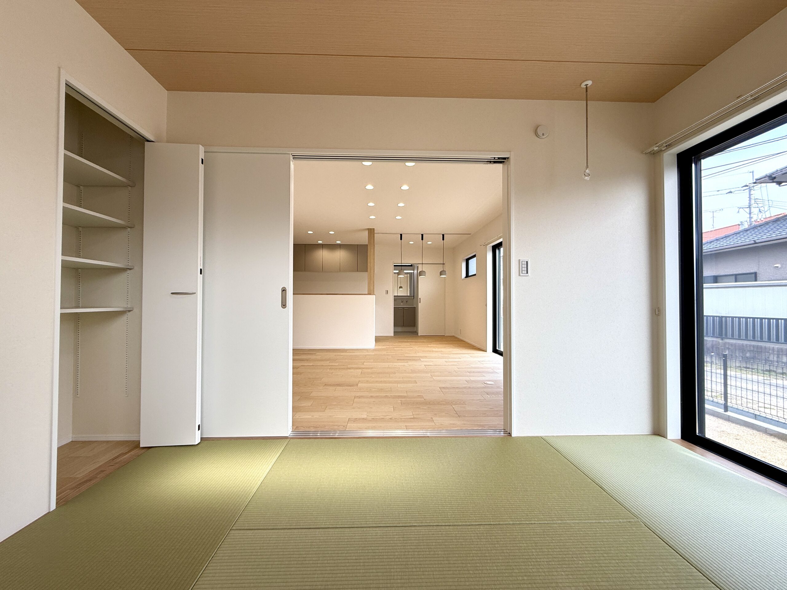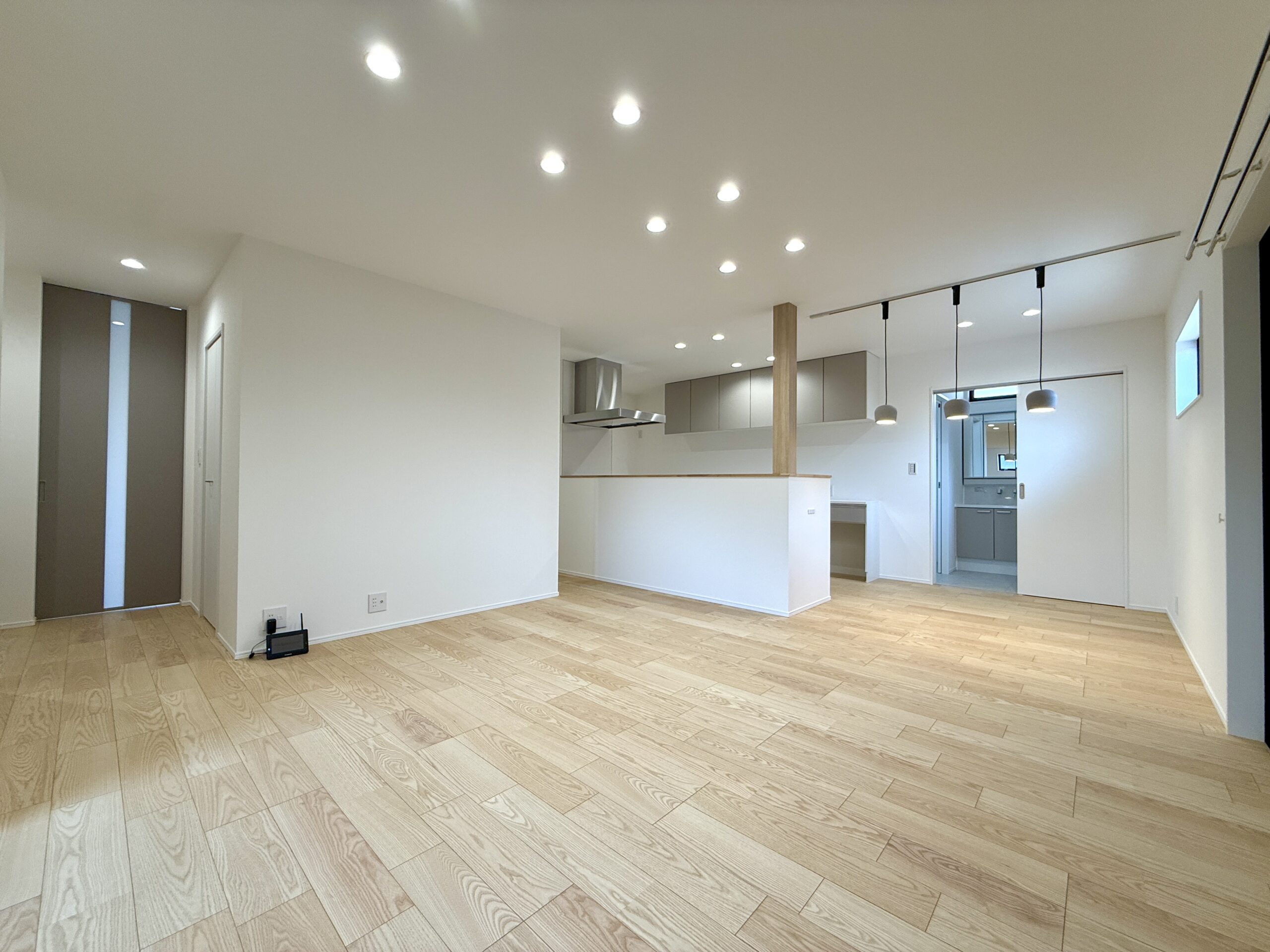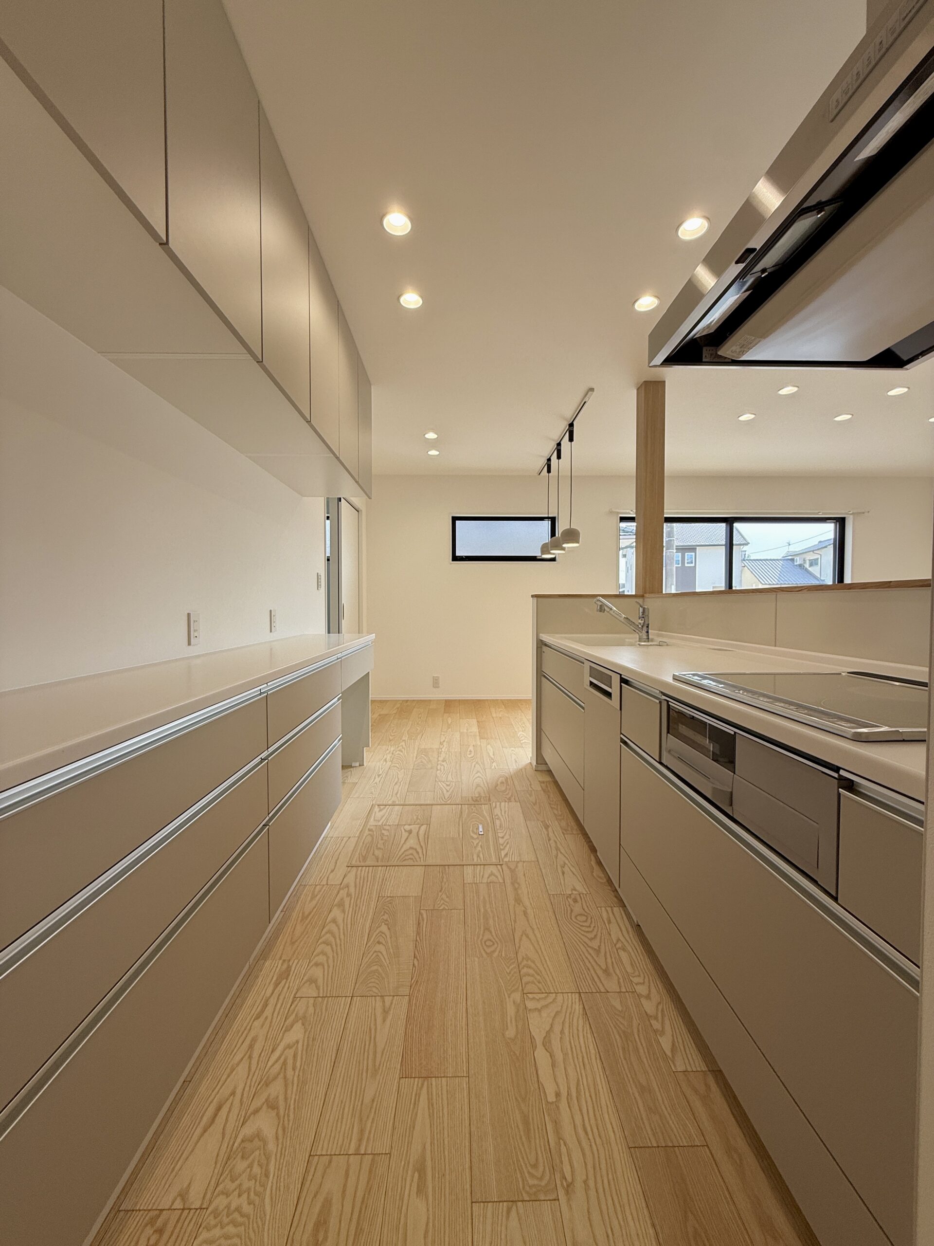 モノトーンでまとめた落ち着きのある外観に、木目の玄関ドアが温かみをプラスしています。デザイン性だけでなく、ゆとりある駐車スペースや、スムーズな生活動線など、日々の暮らしやすさにもこだわった一軒です。